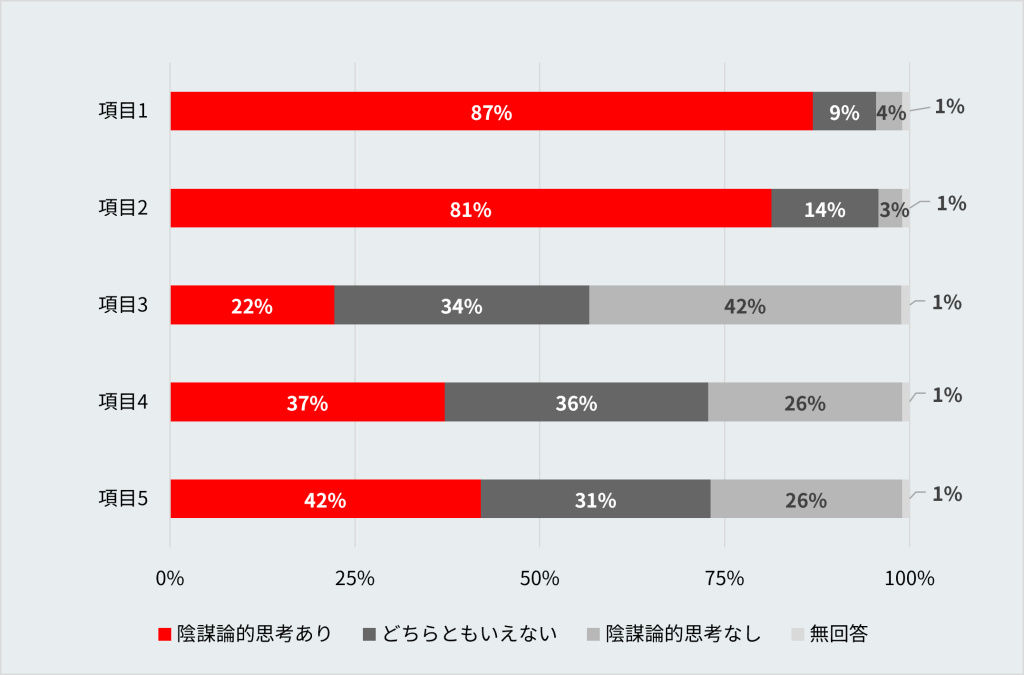 烏谷教授が指摘する「誰でも陰謀論者になり得る」との言葉通り、特に項目1(極秘の事案)および項目2(隠された動機)に関しては、8割超の人が陰謀論的思考に賛同していることがわかりました(注:回答が④⑤を陰謀論的思考あり、①②を陰謀論的思考なしとした)。