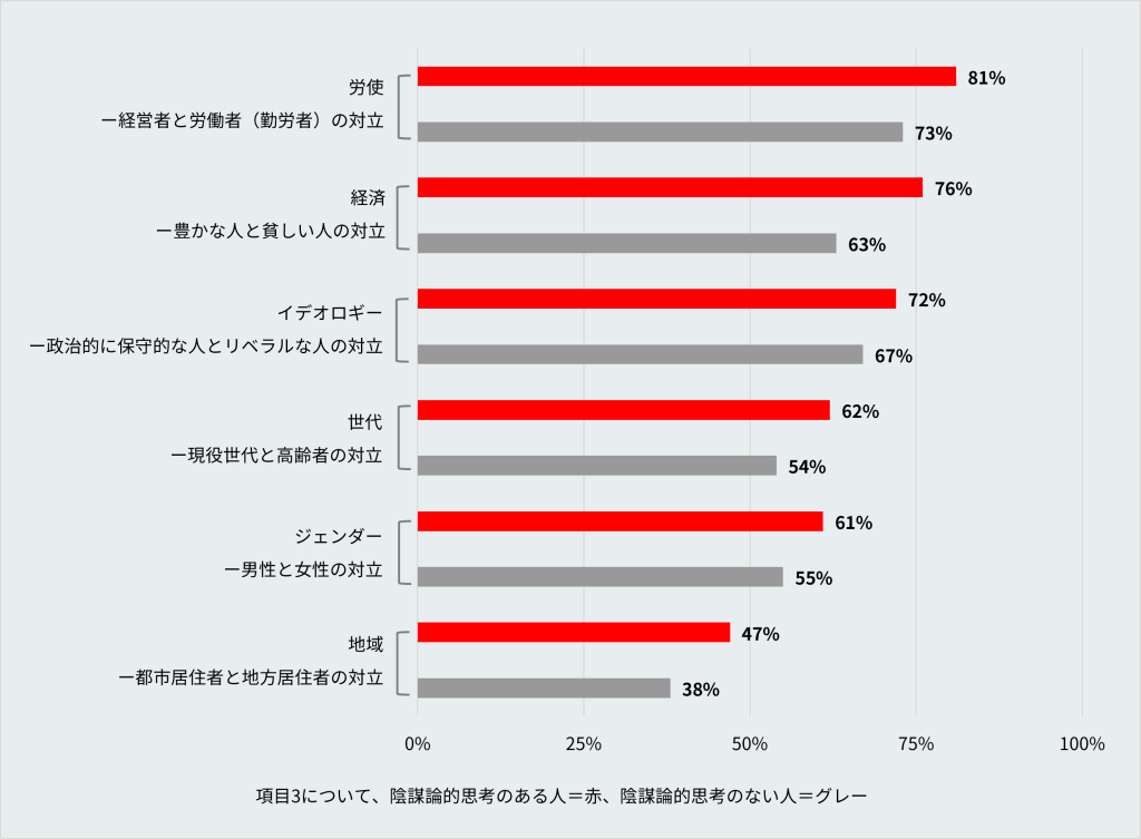 最も「陰謀論的思考あり」の人が少なかった項目3(厳重な監視)について見てみると、陰謀論的思考がある回答者は、陰謀論的思考がない回答者に比べて、「社会的対立」における6項目すべてに対して「対立がある」と回答する傾向が多く見られました(図4)。