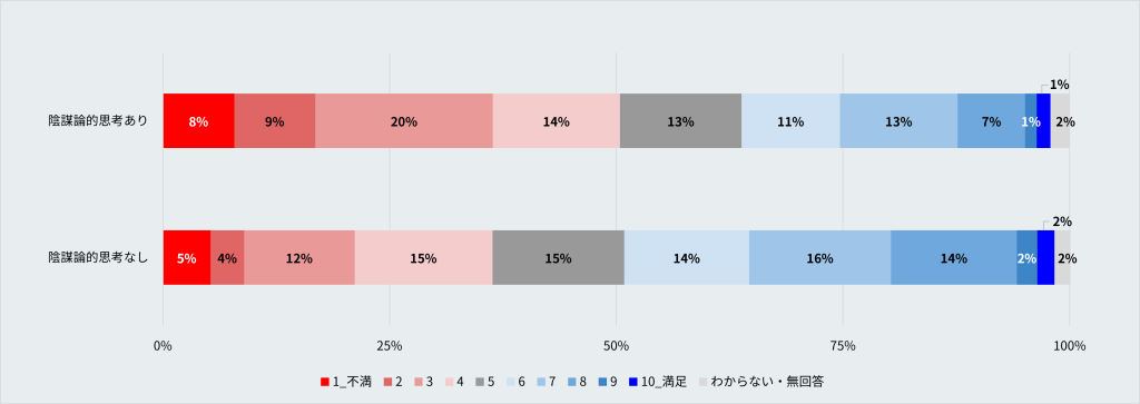 また、項目3(厳重な監視)について、陰謀論的思考がある人の方が、より生活への「不満」を感じていました(図5)。陰謀論的思考がある人の51%が不満がある(1〜4を選択)としている一方で、陰謀論的思考がない人で不満があるとしたのは36%でした。