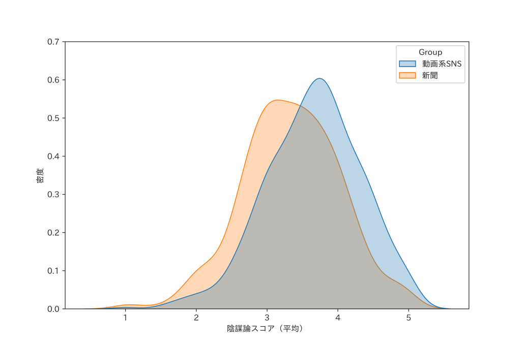 図6:「新聞(オンラインを含む)を主なニュースの情報源とする」人と「動画系SNSを主なニュースの情報源とする」人の陰謀論スコア