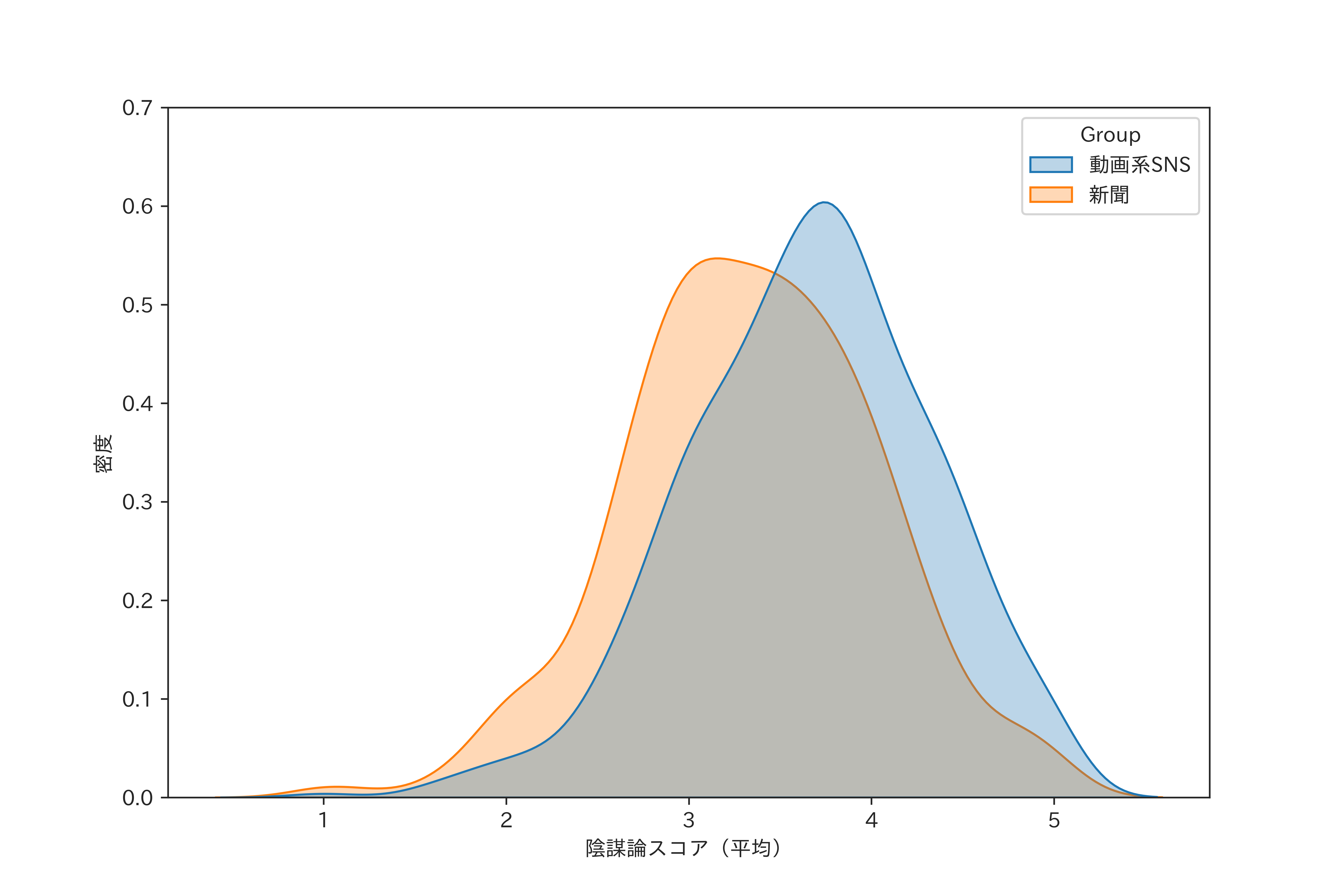 図1 新聞でニュースを読む人と動画サイトでニュースを見る人の陰謀論スコアの分布