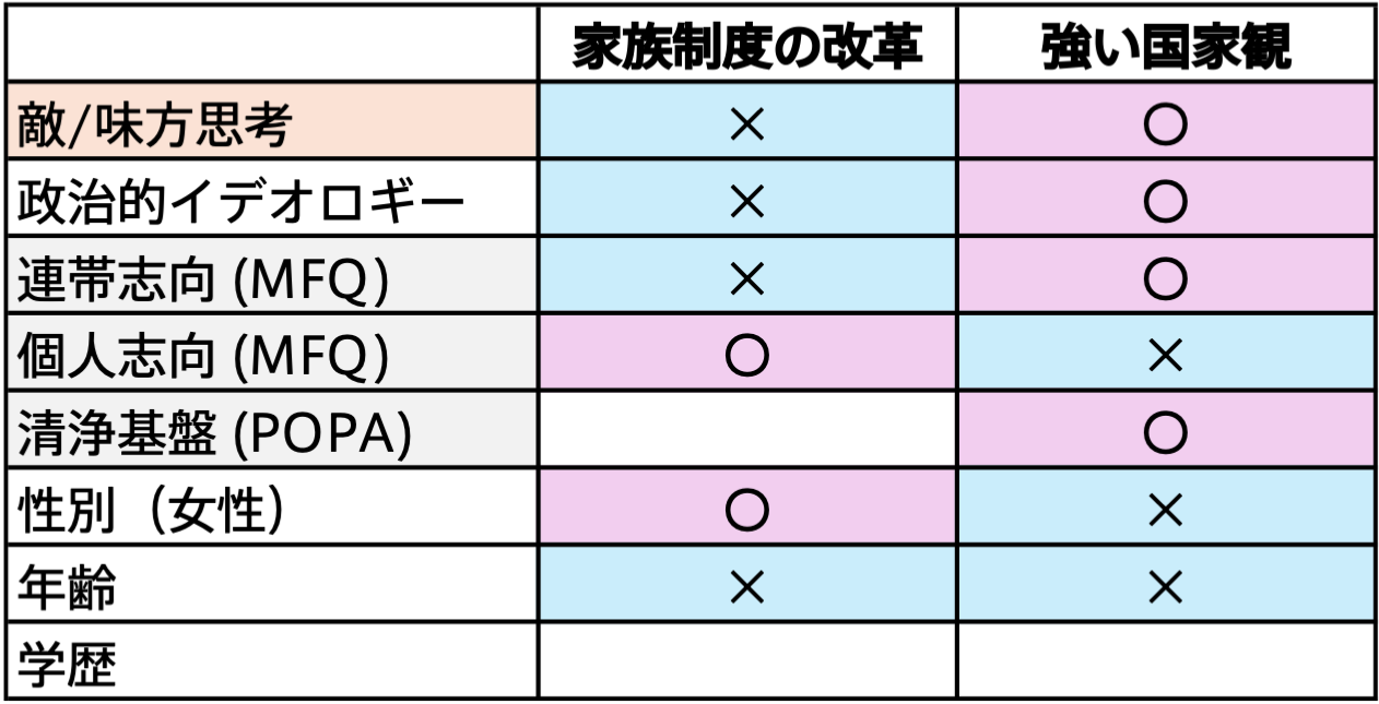 さらに、「敵-味方」思考、政治的イデオロギー、連帯志向(道徳的価値観)の3つが、「家族制度の改革は肯定的だが、強い国家観には否定的」という一貫した傾向を見せた(注:道徳的価値観の詳細については、前回調査の記事を参照)。社会的分断の仕組みを理解する上で、これらの3つがどのような性質の社会問題に対して類似・相違の反応をするのかは、今後の調査でさらに検討する必要がある。