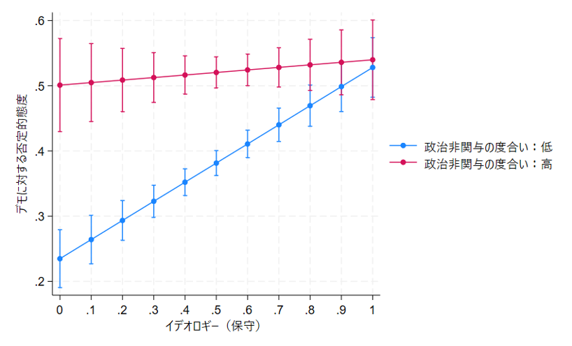 しかし、政治非関与傾向が強い人(赤いグラフ)の場合は、イデオロギーによってデモに対する態度が影響を受けない(赤いグラフの傾きはほぼフラット)。しかも、デモに対する態度は理論的中点である0.5よりもやや上にあり、どちらかと言えば否定的な意見が多い。中点からの乖離はあまり大きくないように見えるかもしれないが、これは最もイデオロギー的に保守的な人と同じ程度のレベルである(図2の右端で、最も保守的な人が政治非関与傾向の強い人に「追いつく」)。したがって、政治非関与傾向の強い人は、イデオロギーに関係なく、デモに対する否定的態度が強い傾向がある。このことは、政治非関与傾向の強い人の間では、プライバシーや権利の制限への支持とイデオロギーの関係が消え、イデオロギーに関わらず賛成が多くなることと一貫している。すなわち、第2回調査においても、政治非関与傾向が強い人は「イデオロギーなき権威主義」的傾向を示している。
