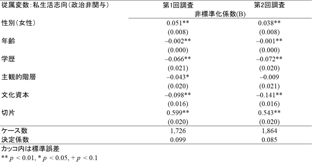 表1 私生活志向(政治非関与)を予測する回帰モデル