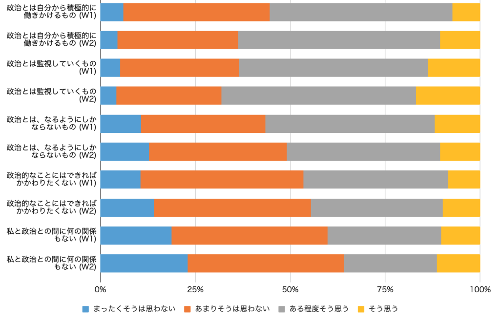 私生活志向の下位概念である政治非関与傾向の特徴に、第1回調査からの大きな変化は見られなかった。しかし、政治非関与傾向のレベルそのものは一貫して低下していることが明らかになった。図3は、政治非関与傾向を測定する個々の項目の、第1回調査(W1)と第2回調査(W2)の分布を示したものである。いずれの項目でも、政治非関与傾向が低下傾向にあることがわかる。たとえば、第1回調査で40%の人が賛成(「そう思う」または「ある程度そう思う」)した「私と政治との間に何の関係もない」という項目に対する賛成率は、第2回調査では35%程度に低下している。