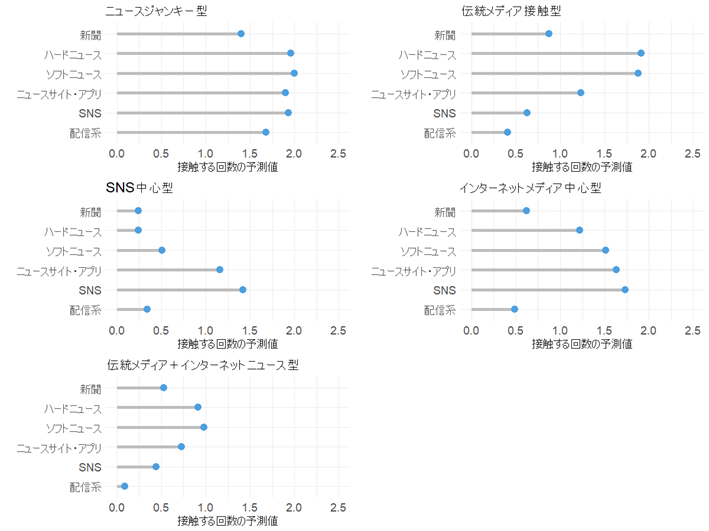 結果は図2のとおりである[4]。各メディアの接触項目(ハードニュース/ソフトニュース/ニュースサイト・アプリ/SNS/配信系)について、算出された選択確率から、各クラスにおける各メディア媒体の接触回数の予測値を算出したものが示されている。