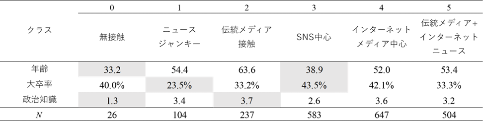 さらに、表1は、接触パターン別に回答者の属性等の特徴をまとめたものである。それぞれの項目は、各クラスに所属する回答者について、「年齢」は実年齢の平均値を、「大卒率」は4年制大学卒業以上の学歴を持つ回答者の割合を、「政治知識」は同調査の政治知識設問について正解した問題数の平均値を示している[5]。