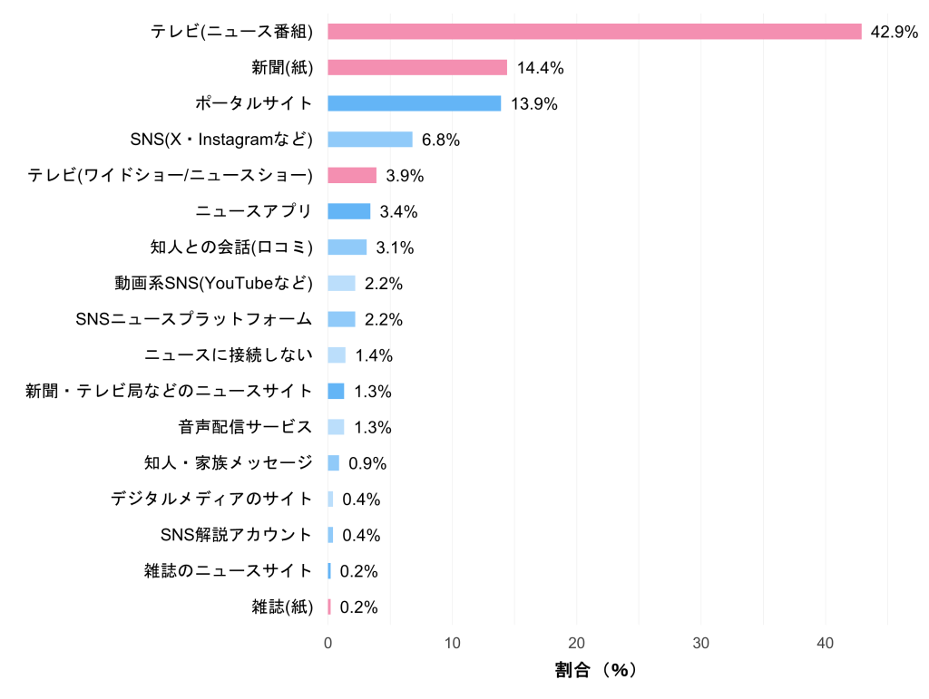 NHKの午後7時のニュースなど定時のニュース番組/民放の定時のニュース番組/NHKのニュースショー(ニュースウォッチ9など)/民放のニュースショー(報道ステーションなど)/民放のワイドショー(めざましテレビ、情報ライブ ミヤネ屋など)/オンデマンド型番組(NHKオンデマンドやTVerなど)/ABEMA、Amazon Prime Video、Huluなどの動画配信サービス/ラジオ、radiko、ポッドキャストなどの音声配信サービス/朝日新聞/産経新聞/日本経済新聞/毎日新聞/読売新聞/お住まいの地域のブロック紙・地方新聞/Yahoo!ニュース(ヤフーニュース)/LINE NEWS(ラインニュース)/SmartNews(スマートニュース)/Googleニュース(グーグルニュース)/NewsPicks(ニューズピックス)/LINE(ライン)/YouTube(ユーチューブ)/X(エックス・旧ツイッター)/Instagram(インスタグラム)/Facebook(フェイスブック)/TikTok(ティックトック)/ニュースの情報源として使っているものはない