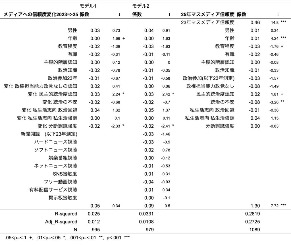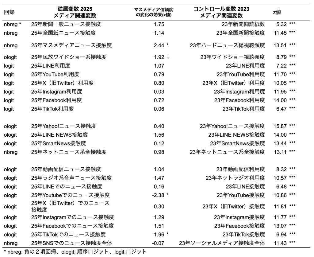 [7]分析上の留意点として、2025年のメディア接触行動の一部項目は、2023年の対応項目と完全には一致していない。たとえば、2025年には「YouTubeのニュース接触」と「YouTube全体の利用度」の2項目があるが、2023年には後者のみが測定されている。そのため、2025年のニュース接触度の回帰分析では、2023年のYouTube利用度を近似変数として投入している。