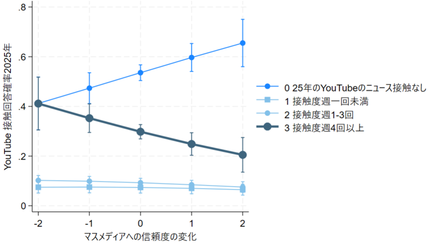 まず、マスメディアへの信頼度が上昇すると2025年にはマスメディアのニュース接触度は増大する。信頼の帰結としてもっともな結果である。他方、インターネット系の接触度では2点のみが有意な効果をもたらしていた。1つ目はマスメディアへの信頼度が低下するとYouTubeでのニュース接触度が増大していたこと、2つ目はマスメディアへの信頼度の増大がTikTokでのニュース接触度を増大させていたことである[9]。