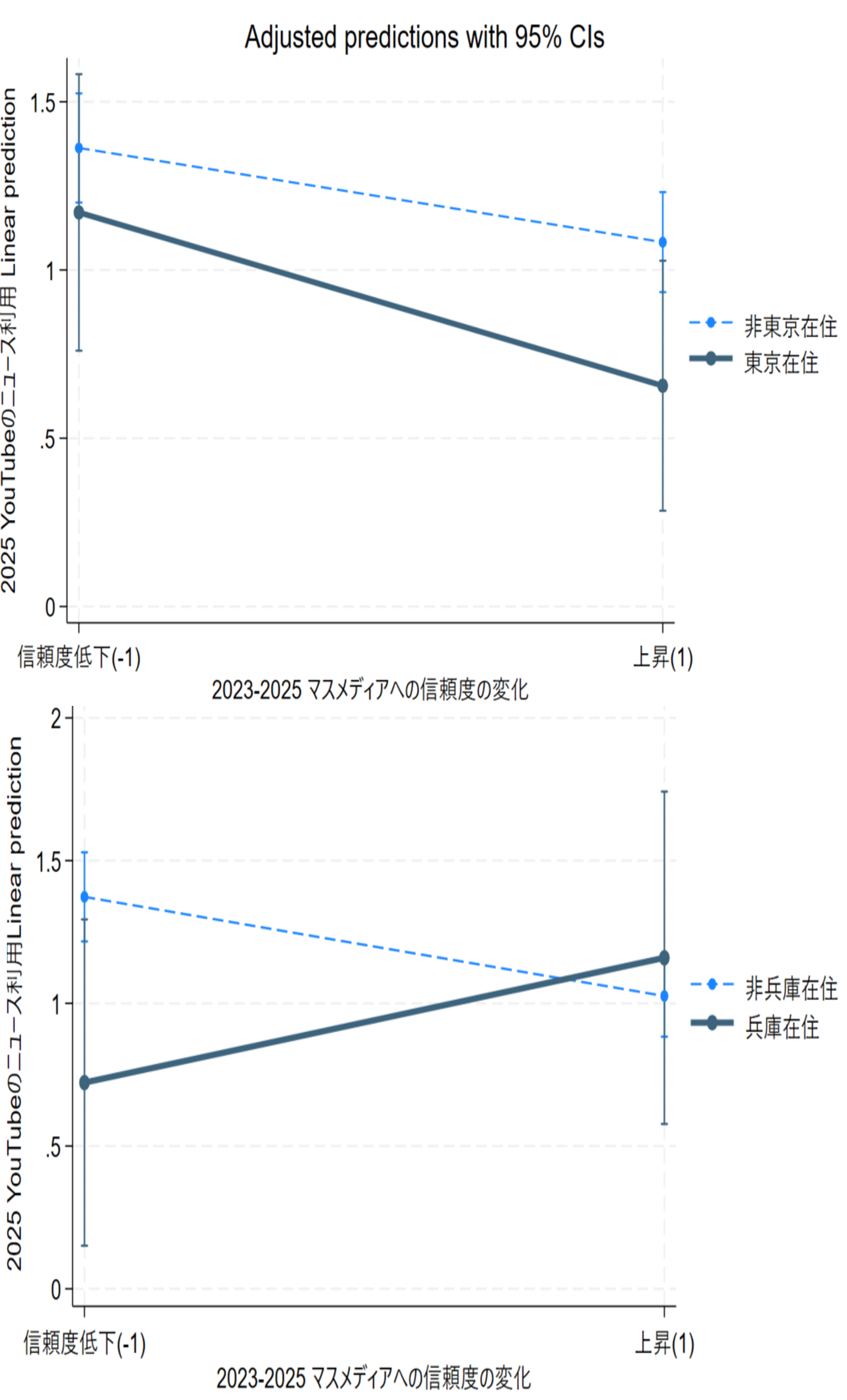 その分析を行うために、YouTubeのニュース接触度を従属変数とした図2の分析のモデルを拡張し、両地域のダミー変数に加え、マスメディア信頼度の変化×地域ダミーの交互作用項を投入した。マスメディア信頼度の変化が、特定地域のメディア接触行動の変化とどう結びついているかを検討するのである(なお、東京都在住者は全国平均よりYouTubeのニュース接触度は低い)。