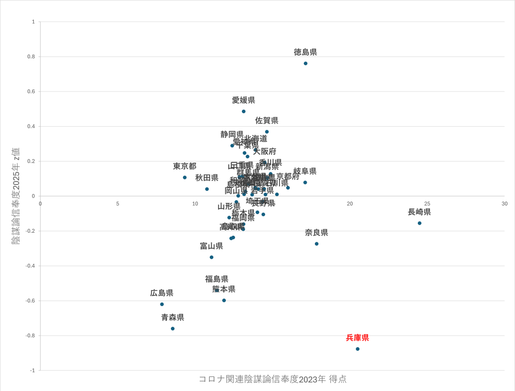二度にわたる陰謀論の支持度の分布をプロットした散布図を作成すると、兵庫県在住者(赤字)がひどく外れ値の位置にあることがわかる。23年のコロナ陰謀論の支持度は最強クラスであったが、2025年の政治の陰謀論の支持度は最低であった(図4)。