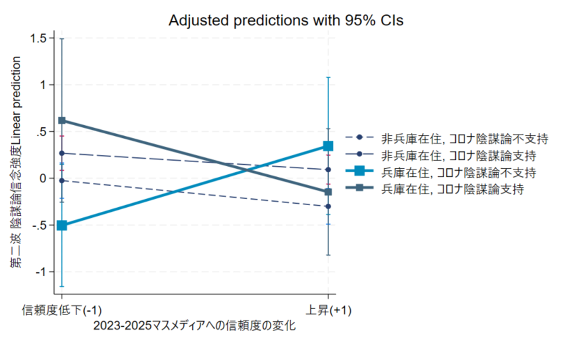 図5はその結果である。全体として、マスメディアへの信頼が低下した人が25年の陰謀論信念の保持に傾いている一方で、兵庫県在住者では陰謀論の非信奉者(標準偏差が-1.5)が他都道府県と異なる信念の変化を示した(交互作用効果は有意)。他地域では、マスメディアの信頼度低下と2025年の陰謀論支持はやや正の関連を示している一方、兵庫ではマスメディアへの信頼度が低下しても、コロナ陰謀論非信奉者は政治的陰謀論への支持が他より低かった(右肩上がりの太線)。もっともマスメディアへの信頼を失った2023年の陰謀論肯定者では2025年に肯定のままである(左肩上がりの太線)ことは、他地域と同傾向であるが、兵庫県在住者ではマスメディアへの信頼が低下してもそれが政治的陰謀論支持につながるのは元々陰謀論的素地を持った人々に限られていた(注10に示したDouglasらの知見とも一貫している)、ということになる。